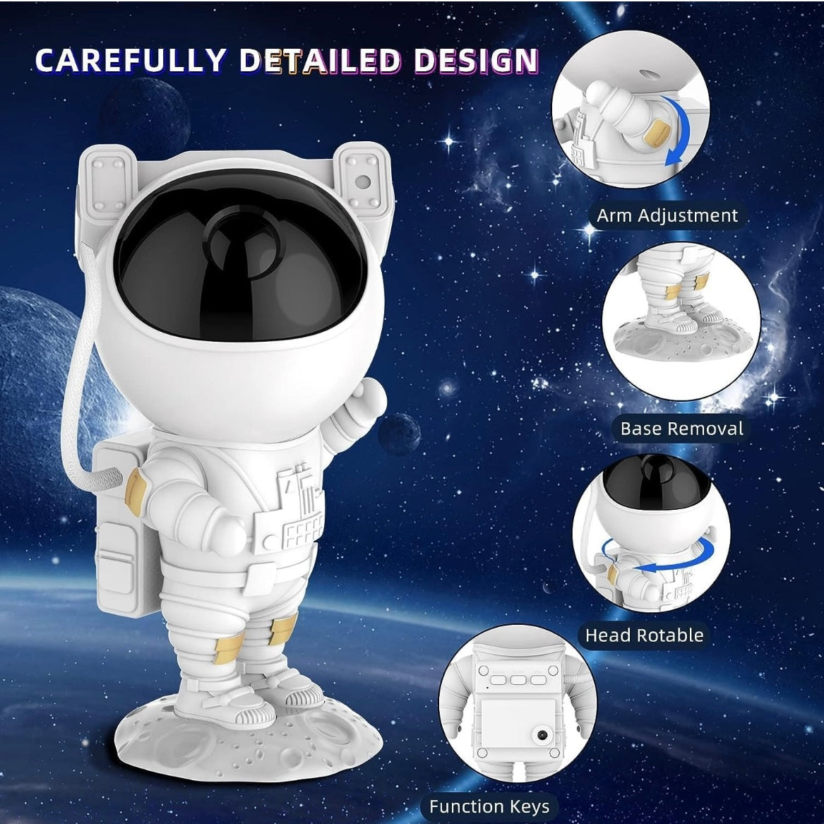 With Astronaut Projector's magnetic, adjustable head, you can easily adjust the projection of your nebula. So you can project your sea of stars on the ceiling, wall, or even floor.