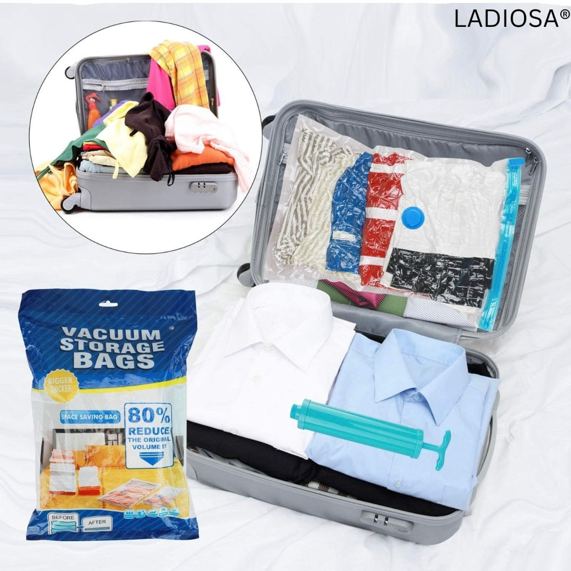 Our vacuum storage bags are essentials for both household space saving and travel organization. Function as storage bags for clothes and compression bags for travel.