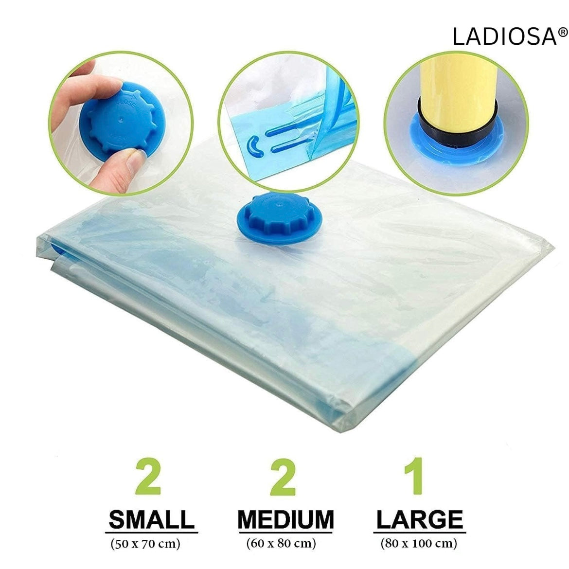 It comes with 5 bags, small(2 pieces), medium(2 pieces), large(1 piece). Small - 50 cm x 70 cm. Medium - 60 cm x 80 cm. Large - 80 cm x 100 cm. 1 Suction Pump.